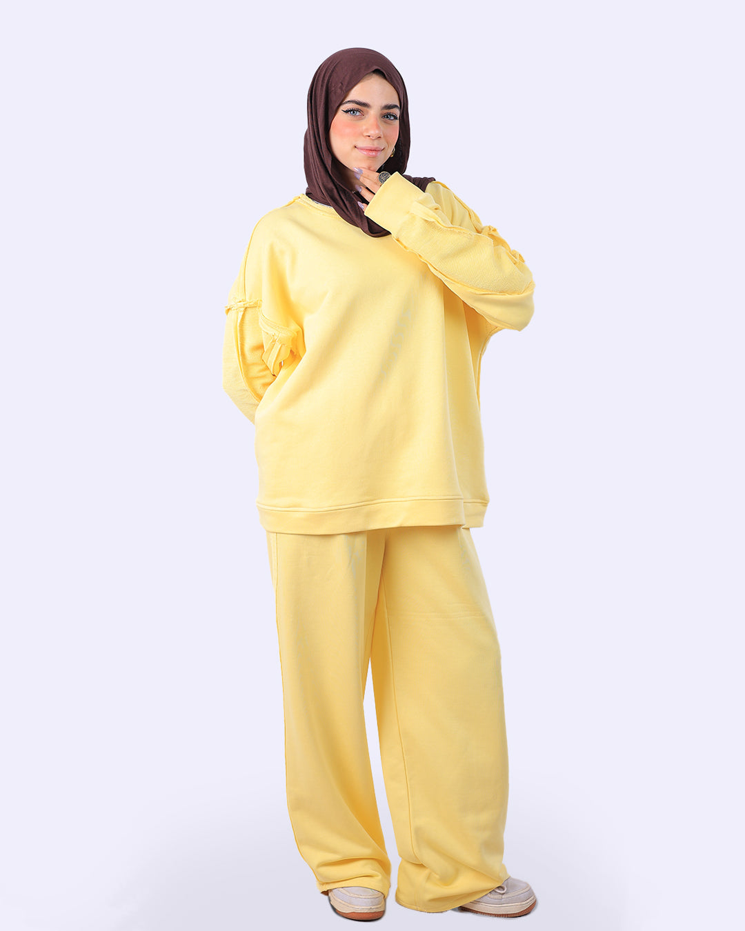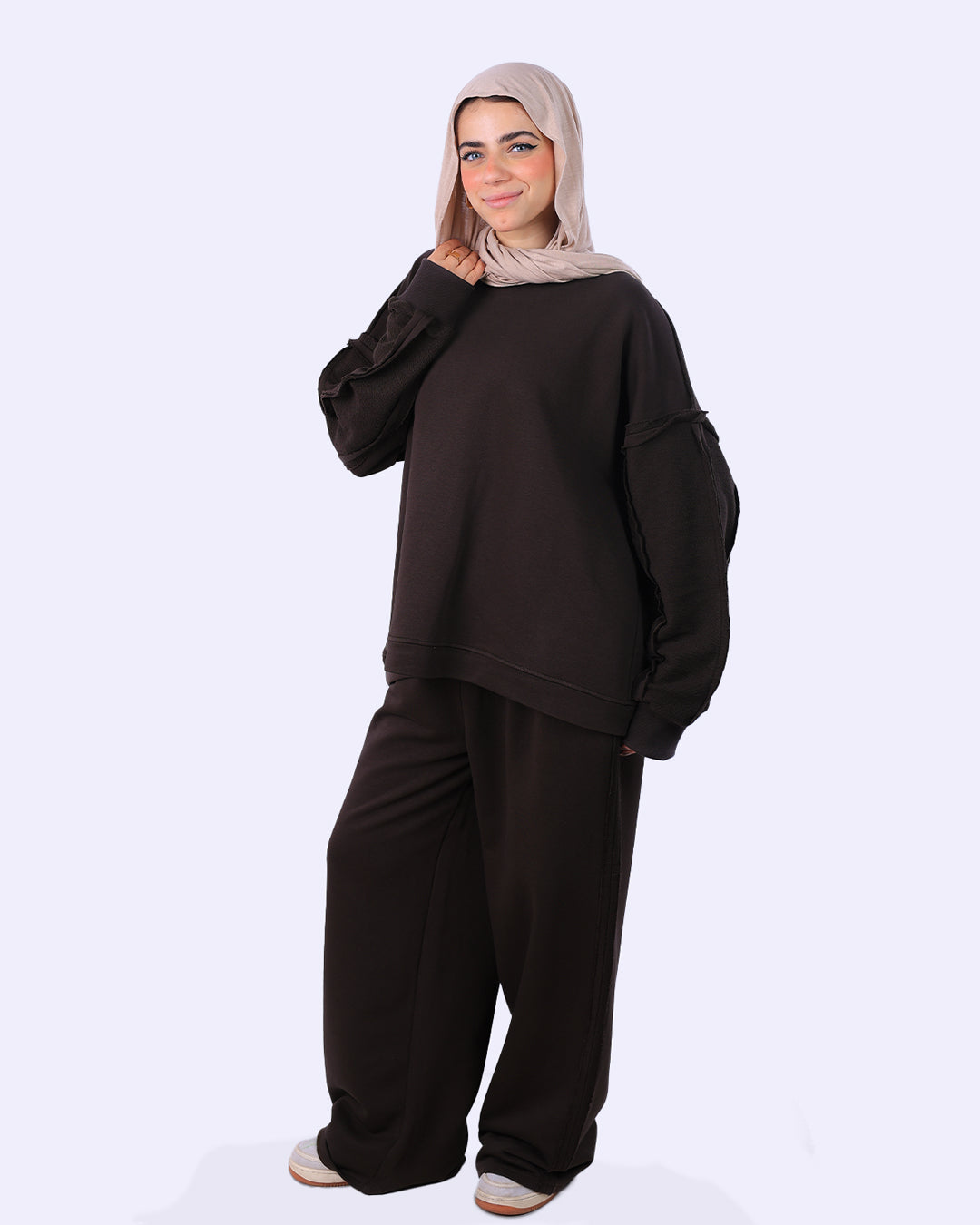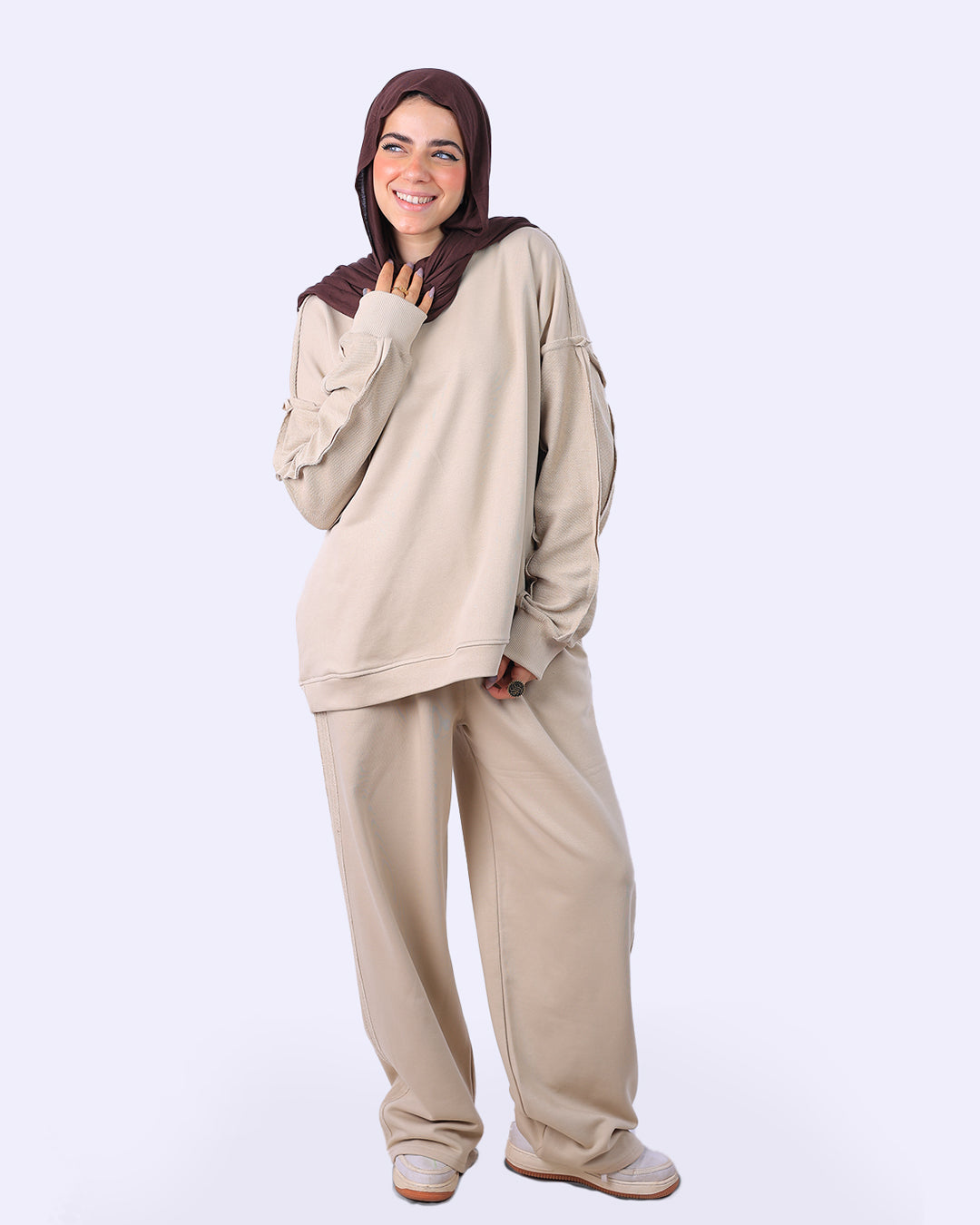طقم قطعتين: يتكون من سويت شيرت بقصّة مريحة وبنطلون واسع (Wide Leg) لضمان الراحة التامة وحرية الحركة.