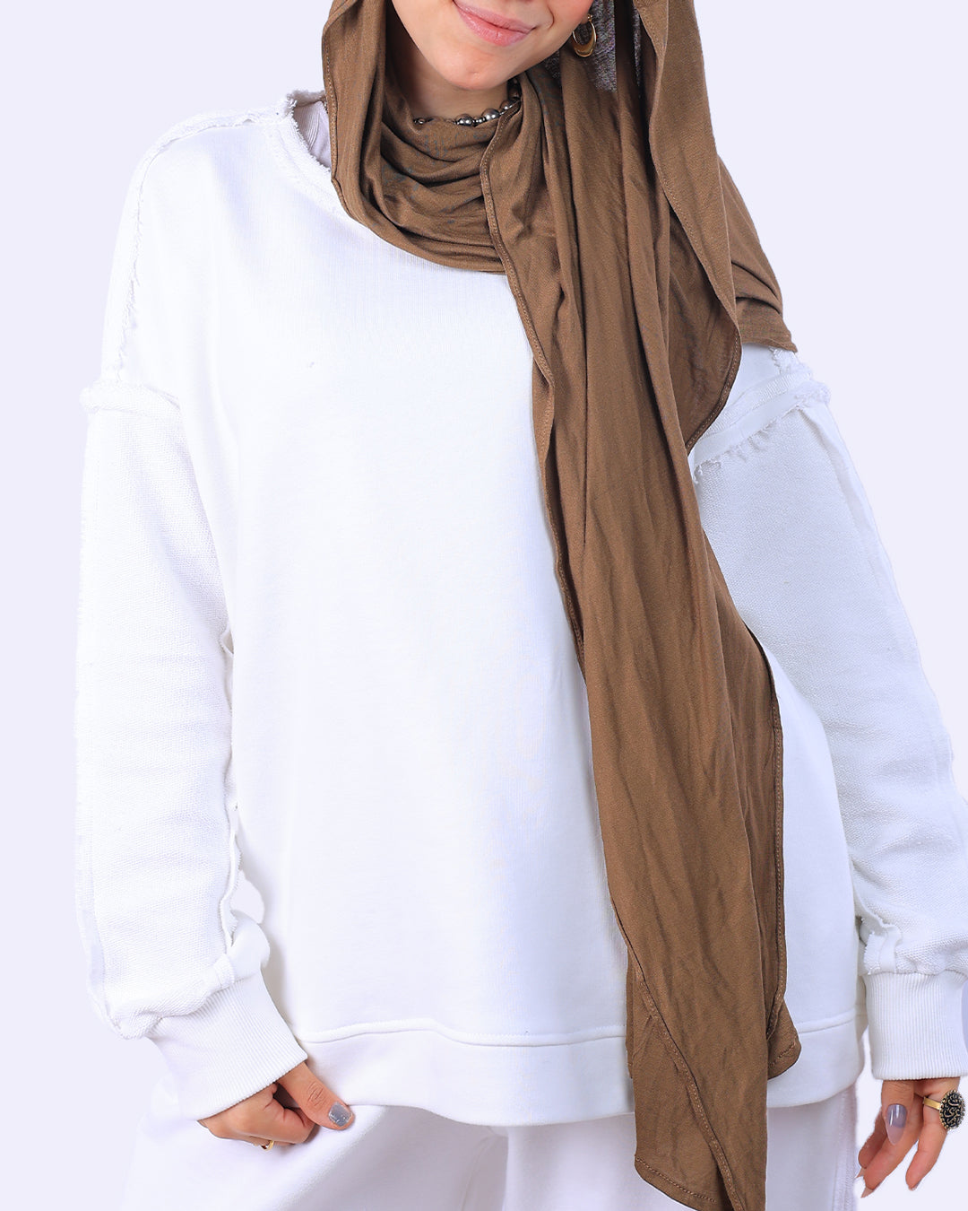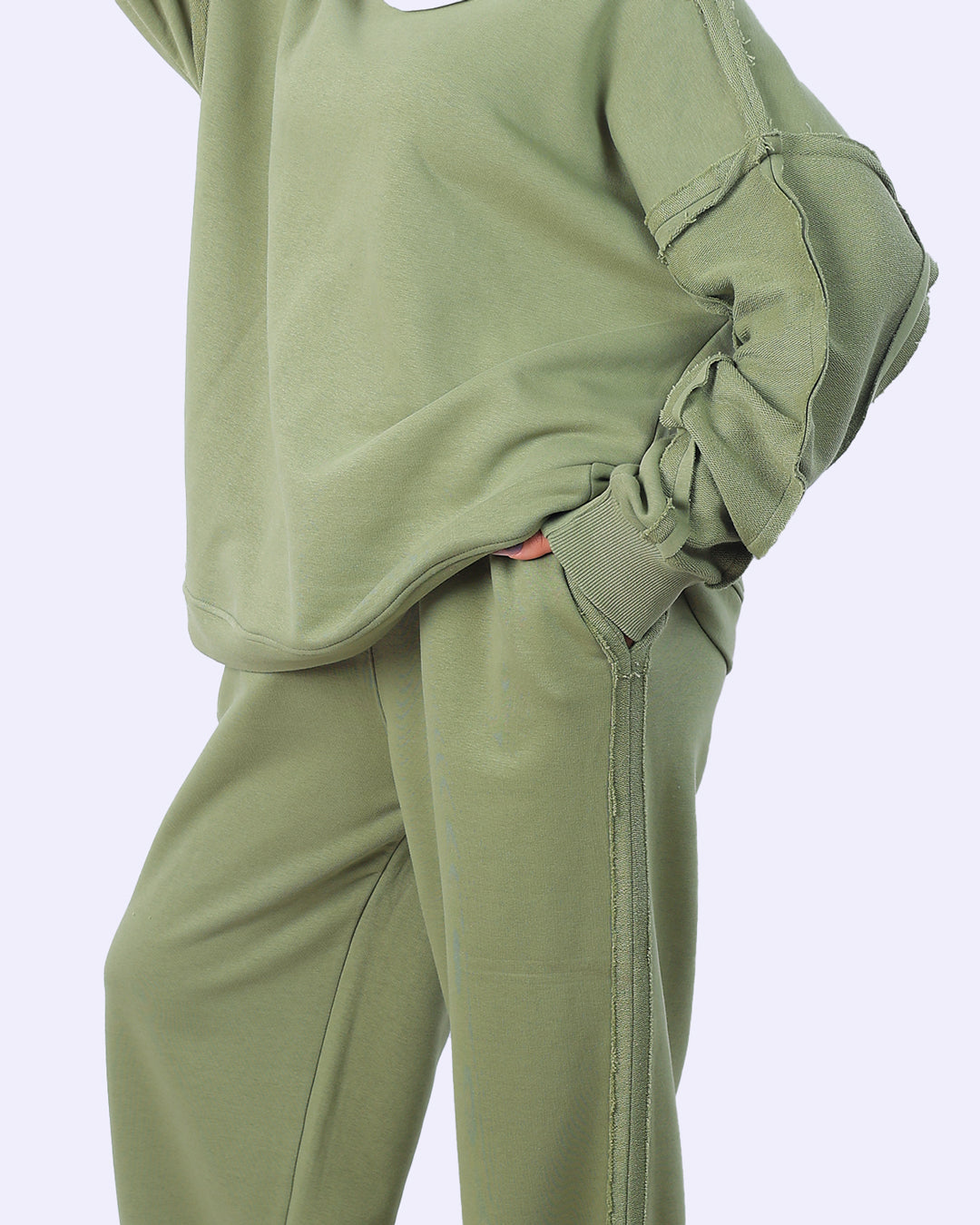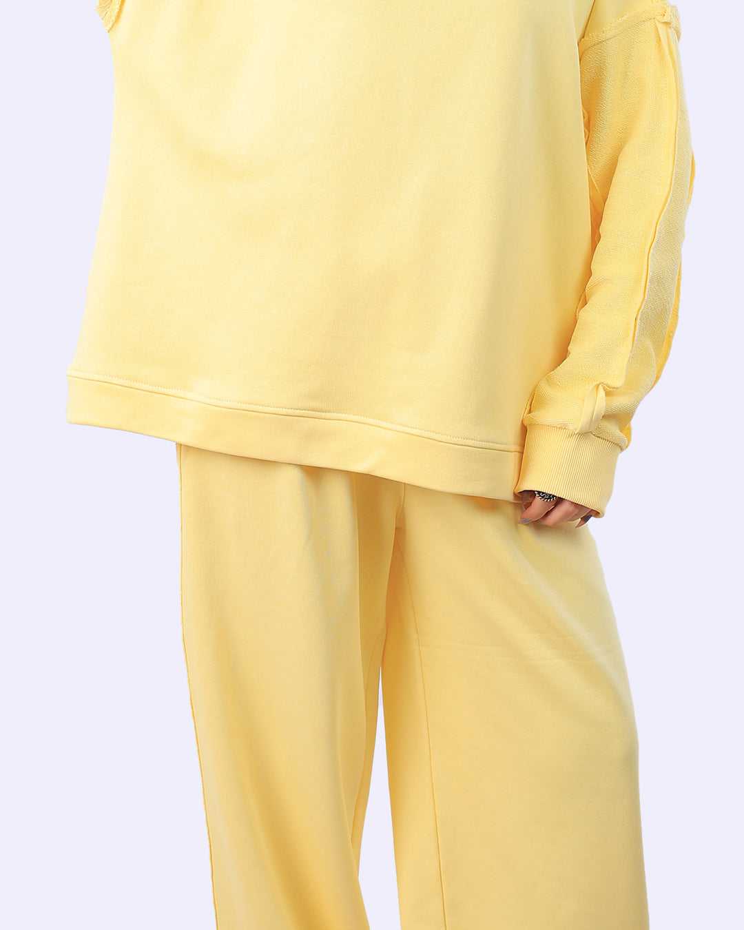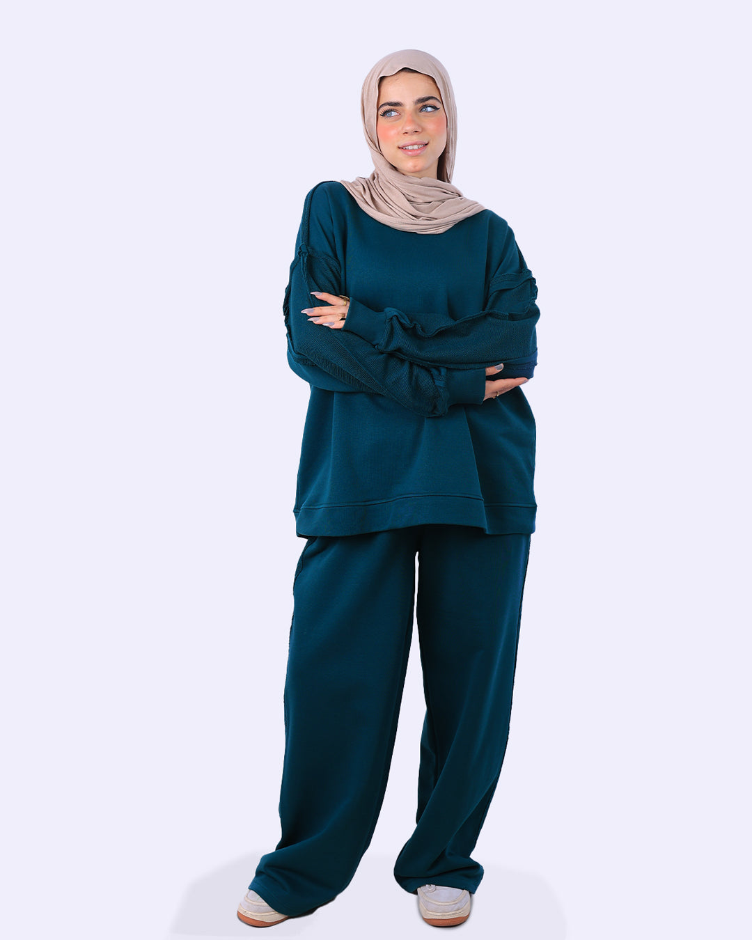 طقم قطعتين: يتكون من سويت شيرت بقصّة مريحة وبنطلون واسع (Wide Leg) لضمان الراحة التامة وحرية الحركة.
