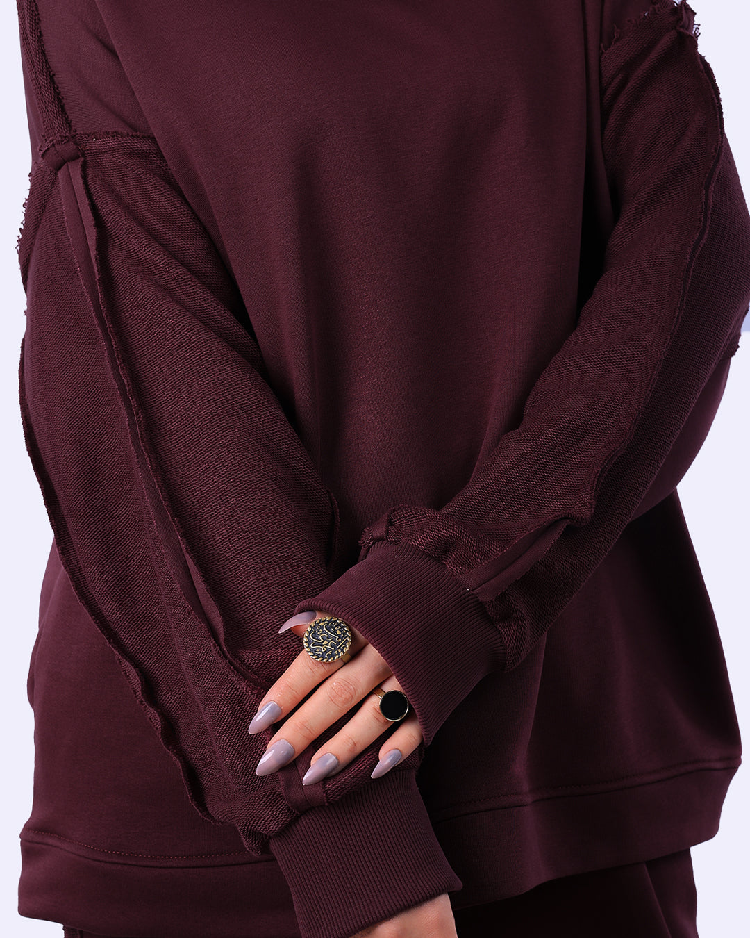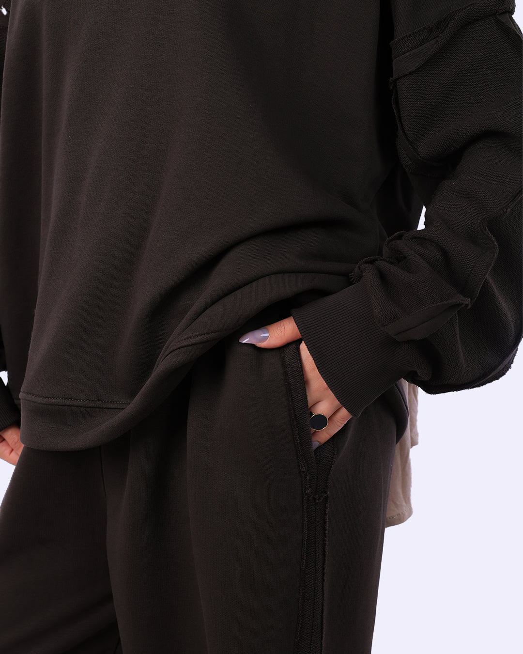 تصميم Inverted (مقلوب): يتميز بتفاصيل خياطة بارزة للخارج (Exposed Seams) على الأكمام والجوانب، مما يمنح الطقم مظهراً عصرياً وجريئاً (Deconstructed Style).